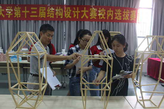 本网讯(记者 余仙梅)为了培养学生创新思维、团结协作精神和实际动手能力,营造浓厚学术氛围。10月24日下午两点四十分,华南理工大学第十三届土木结构设计大赛我校选拔赛在B1-104、B1-105正式拉开帷幕。此次选拔赛的评委有王勇副教授,赵小芹老师、熊逸丰老师和冯志镔老师。参赛的选手来自各个学院大一至大三的学生。