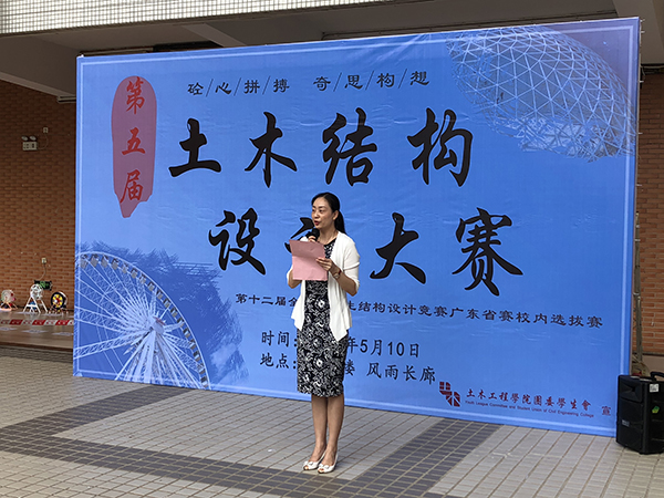 本网讯(记者 李嘉嘉 殷文彬)5月10日下午,土木工程学院在风雨长廊举办了2018年科技学术节之第五届土木结构设计大赛暨第十二届全国大学生结构设计竞赛广东省赛校内选拔赛,学院相关负责人、专业教师、参赛学生共计200余人出席了本次大赛。土木工程学院相关负责人为大赛致辞并提出,希望通过本次比赛,一方面“以赛促学”,为同学们创造一个切磋技艺、展示水平的舞台;另一方面“以赛促教”,促进学院加强专业教学水平、全面提高教学质量。