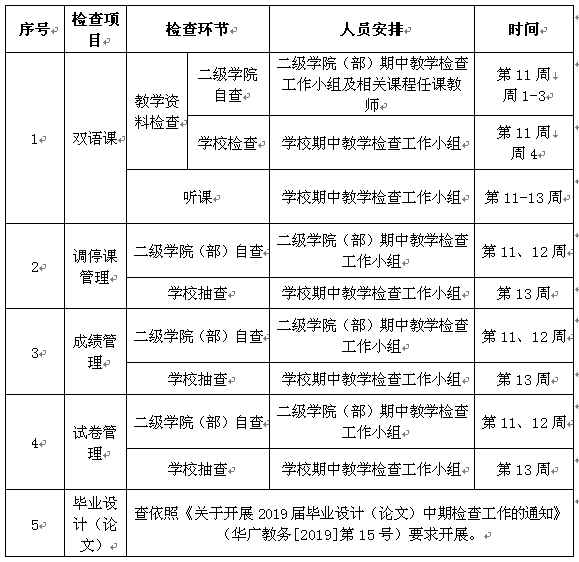 (一)本次期中教学检查安排在本学期第11—13周。总体安排如下: