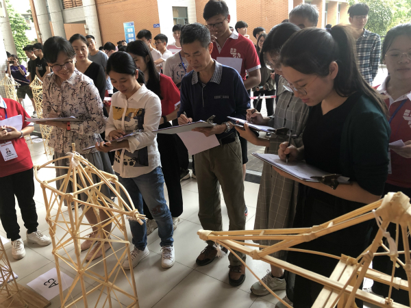 在流动式评委评分环节,专家、老师们对挑战组和趣味组分别进行评分与评价。挑战组的精雕细刻与趣味组的不落窠臼让老师们纷纷称赞。在随后紧张刺激的加载试验环节,试验过程简单概括为:加载共分为三级,前两级测抗压强度,第三级测抗拉强度。加载开始时,用铁钉固定试件于桌面,参赛人员将绳子挂在试件上,并在其另一端挂上砝码,测量其最大承重量且偏移距离小于12毫米则成功通过该试验。本次挑战组共有14支队伍参加加载实验。