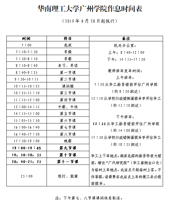 根据学校教学需要,经研究,决定在原作息时间表上增加第9-11节课的上课时间,并下发新的作息时间表(见附件)。新作息时间表定于2019年8月28日起正式执行。各部门要根据新的作息时间表安排工作,确保教学工作正常有序进行。