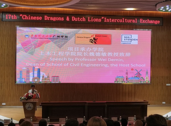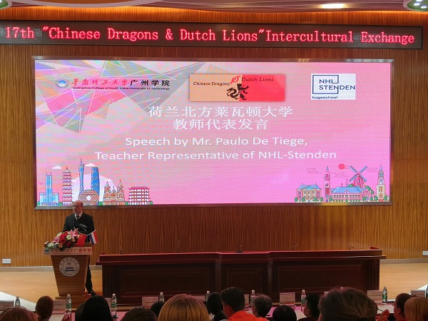 本网讯(记者沈曼萱 殷文彬 谢晓敏)第17届“中国龙·荷兰狮”华工广州学院与北方莱瓦顿斯坦德大学(下称“NHL-Stenden”)双周跨文化交流活动的开幕仪式于10月14日上午在行政楼703举行。广州市花都区委员会办公室副主任唐联彬、广州市花都区人民政府办公室外事科科长宋俊杰、我校副校长曾令涛、国际商学院院长兼国际教育与交流中心主任吴立广、土木工程学院院长魏德敏、学生工作处处长张郡、财务处处长高霞、学校办公室常务副主任任远、教务处常务副处长刘佳、荷兰NHL-Stenden大学Paulo De Tiège、 Laura Velten、Mariska Van Cronenberg、Marno Akkerman、Annabel Louise Maria Pol等五位老师及我校国际教育与交流中心及土木工程学院相关负责人和老师、荷兰交流团学生45人、我校全体伙伴学生及志愿者92人参与了开幕式。