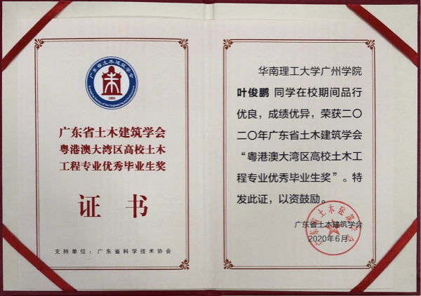广东省土木建筑学会粤港澳土木工程优秀毕业生奖是由广东省土木建筑学会设立的专门奖项,其旨在表彰品学兼优的粤港澳高校应届本科土木工程、工程管理专业毕业生,从而进一步提升我省土木工程专业学生培养水平,充分发挥优秀毕业生的示范带动作用,激励和引导广大土木工程学生健康成才。每年在全省高校评选中,均有中大、华工、暨大等高校学生同台竞技,20名优秀学子,我校学生能有机会获此殊荣,实属不易。“我能获得这个奖项,离不开学院领导、老师四年来的教导、培养与帮助”,叶俊鹏说到。