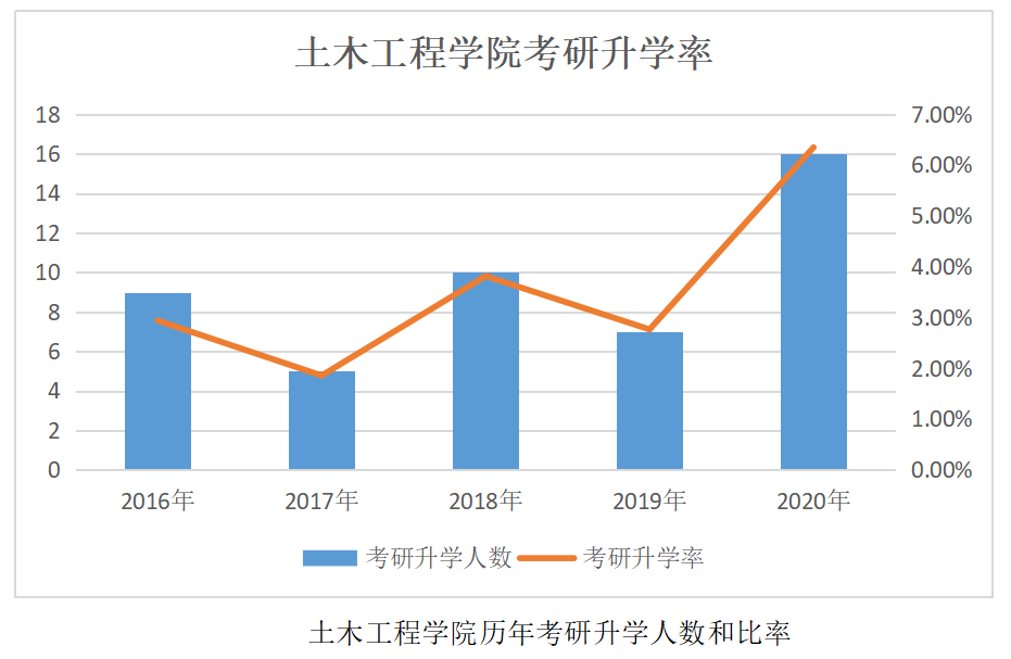 土木工程学院高度重视学生考研工作,专业教学和日常管理服务密切配合,共同营造良好的学习环境和氛围,我院毕业生的考研升学率从2015年的2%左右,逐年攀升,2020年考取国内知名高校研究生共16人,考研升学率达到了6.35%,远高于全校平均的考研升学率。近5年来,土木工程学院共有48名学生成功考取国内外知名大学研究生。