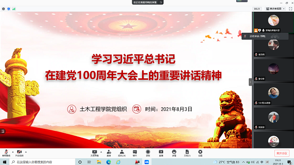 本网讯(记者 林惠 李香)为深入学习习近平总书记在庆祝中国共产党成立100周年大会上的重要讲话精神,8月3日,土木工程学院书记郑梅以《学习习近平总书记在建党100周年大会上的重要讲话精神》为主题开展了线上专题党课,全体师生党员共31人参加本次学习。