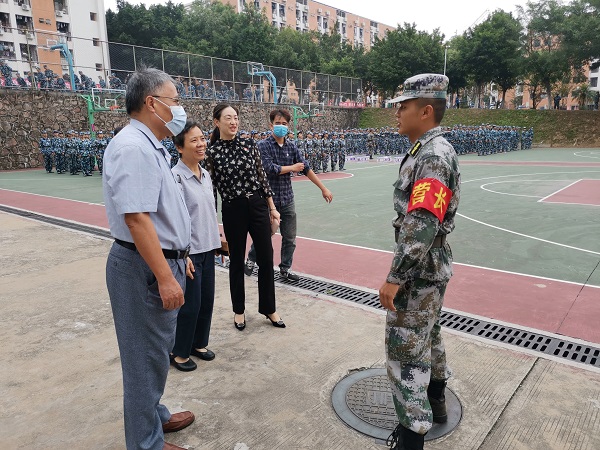 院长魏德敏通过与主管营长的交涉,了解到近期2021级新生们的训练情况,感受到了新生们坚定的意志,并向教官们表示了谢意,同时也希望教官能够从严管理,将这些青春学子历练成为一支精干卓越的精英梯队。主管教官对2021级新生同学们也给予赞扬,并对军训各方阵的新生参训情况进行汇报说明。