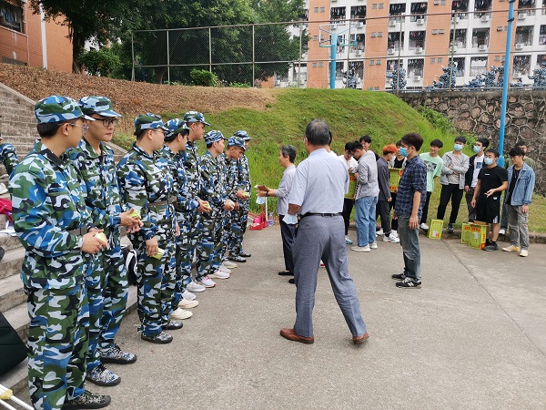 本网讯(记者曾子俊 李香)为了让2021级的新生们感受到土木工程学院的关怀,慰问在训练场上认真训练的新生学子,使大家更加坚定国防教育的决心、践行爱国爱党的实践,11月4日上午,土木工程学院领导、教师一行为学院2021级的新生同学们组织举办军训“送清凉”慰问活动。参加军训“送清凉”慰问活动的领导有院长魏德敏、副院长张原、党总支书记郑梅、学工办副主任陈穗君、班导师熊逸丰、2021级辅导员李香、以及团学学生代表和各年级学生代表。