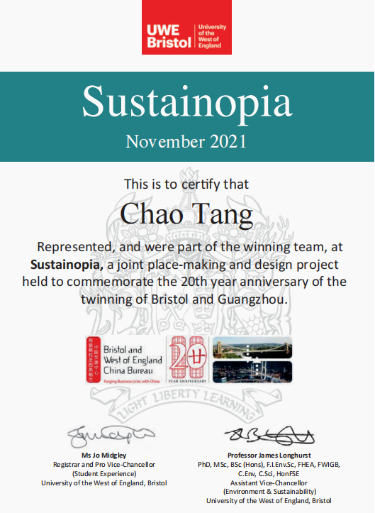 据悉,此次竞赛由英国西英格兰大学(University of the West of England)主办,广州市外事办公室、里斯托市政厅及多所广州高校协办的“城市可持续发展”线上创意学术竞赛中,其所在团队的规划方案在接受来自英国皇家规划协会主席、英国社会科学院院士杨威教授、英格兰大学的专业教授,以及其他业界专家组评审后,最终脱颖而出并获奖,且后续将代表西英格兰大学参加英国西南地区大学联赛。