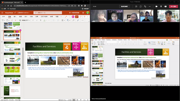 此次竞赛共有30名学生,其中15名来自西英格兰大学城乡规划、筑学等专业的本科及硕士研究生,另外15名则来自华南农业大学、韶关学院、广州城市理工学院等高校不同专业的学生。英中合作组成5组竞赛队伍,在布里斯托市郊一块废弃的工业用地合作设计一座低碳、可持续发展的城市。唐潮同学的方案以美国西雅图煤气公园及广州太古仓为例,着重讲解了废弃工业园如何变为文创社区契合联合国17项可持续发展目标、满足公众精神文化需求并且达到低碳、减少二次污染的城市可持续发展的目的。