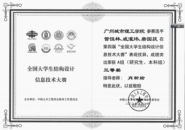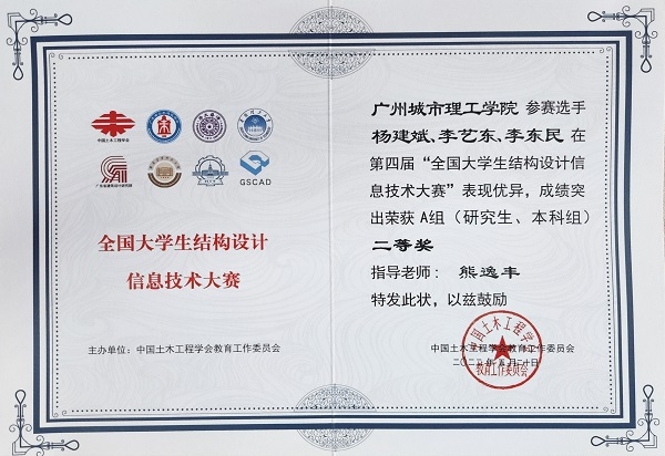 本网讯(记者 唐国获 李香)6月1日,我校收到“第四届全国大学生结构设计信息技术大赛”传来的获奖证书,经过与国内215所知名高校的激烈角逐,土木工程学院师生在此次全国竞赛中斩获佳绩,分别荣获A组“二等奖”和“三等奖”。
