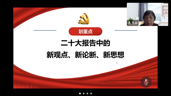 本网讯(记者 杨文娟)为深入学习宣传贯彻党的二十大精神,切实把学院教师的思想行动统一到党的二十大精神上来,12月8日晚,土木工程学院通过线上形式召开学习贯彻党的二十大精神宣讲会。会议由学院院长季静主讲,学院书记郑梅、副院长张原以及全体教职工参加宣讲会。