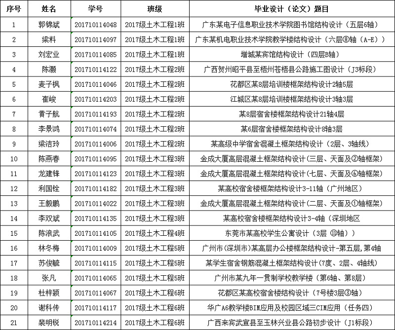 根据《华南理工大学广州学院优秀毕业设计(论文)及毕业设计(论文)优秀指导教师评选办法(试行)》(华广教〔2018〕57号)及《关于评选和推荐2021届优秀毕业设计(论文)及毕业设计(论文)优秀指导教师的通知》(城理教务[2021]33号),经学个人申请,学院推荐,教务处审核,我院共2位教师获得“毕业设计(论文)优秀指导教师”,21位同学获得“优秀毕业设计(论文)资格”。具体获奖信息如下: