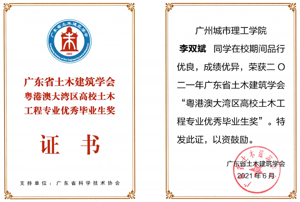 本网讯(记者 李双斌 李香)6月22日,我校收到由广东省土木建筑学会寄来的2021年度广东省土木建筑学会“粤港澳大湾区土木工程专业优秀本科生毕业生奖”荣誉证书,土木工程学院2017级土木工程3班李双斌同学获此殊荣。