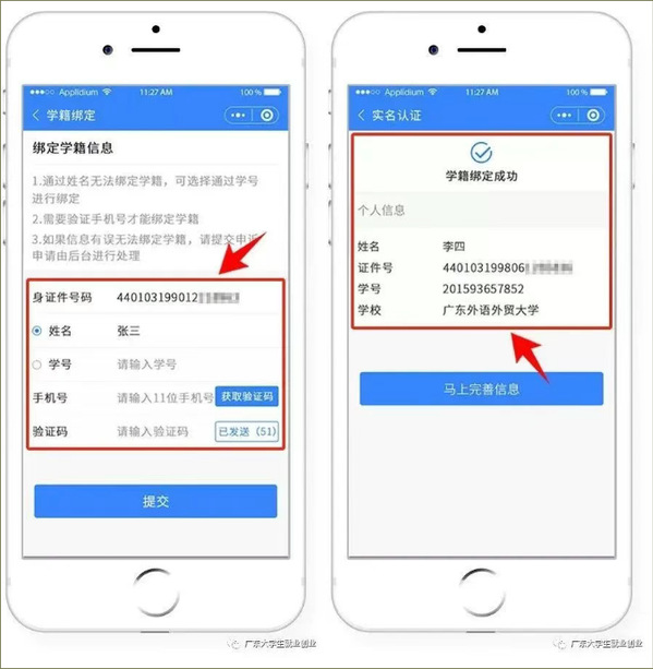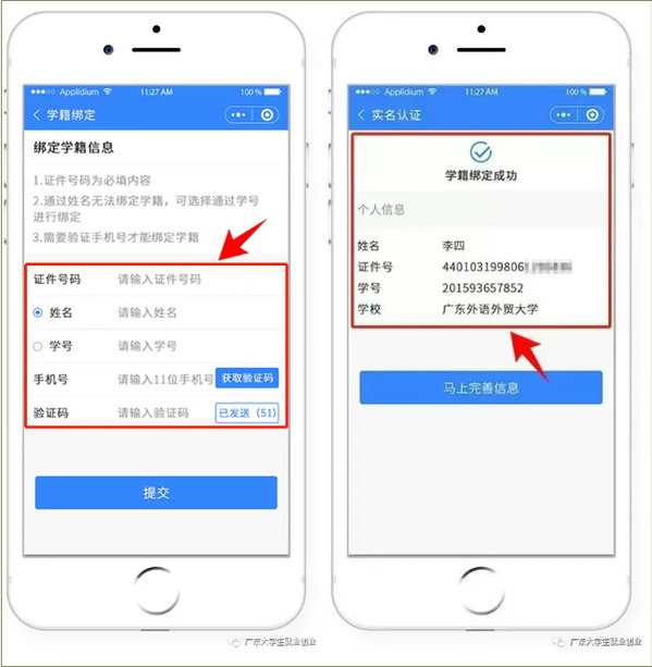 3、“刷脸”成功后,即可进行“学籍绑定”,点击“马上完善信息”可进入“个人信息”绑定的操作。