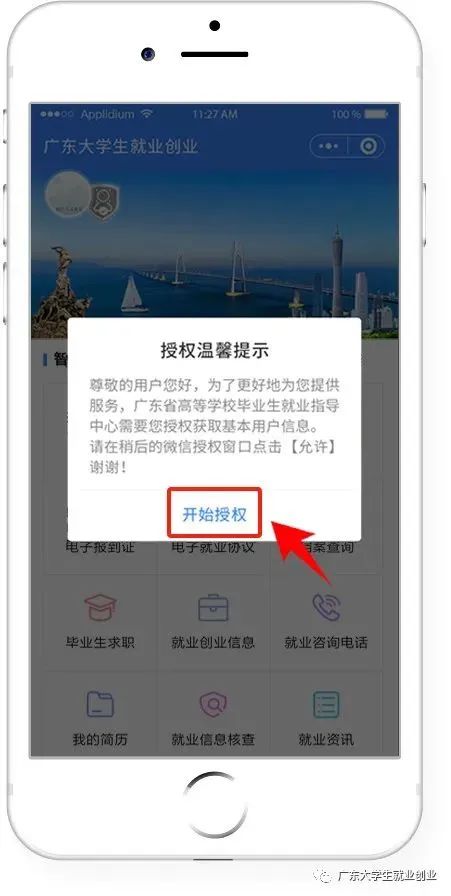 1、进入“广东大学生就业创业”小程序,首页自动显示授权温馨提示,点击“开始授权”弹出小程序授权窗口。