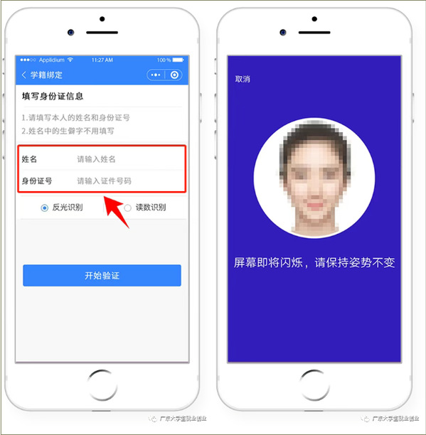 2、进入“学籍绑定”页面,点击”开始验证”,并完成人脸识别身份认证。