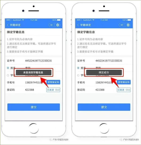 3、若绑定学籍失败,系统会显示具体原因,请重新绑定,成功后提交。