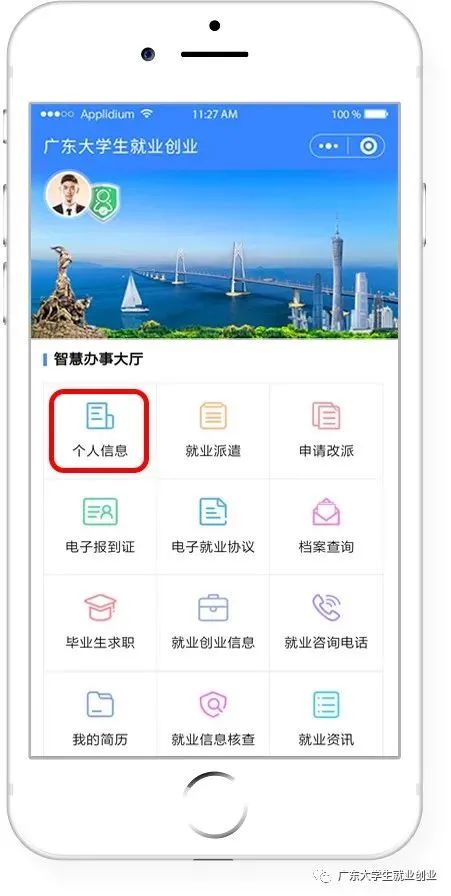 1、登录“广东大学生就业创业”小程序后,可选择从首页进入“个人信息”窗口。