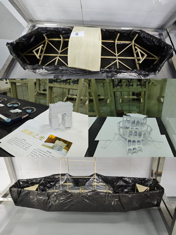 本届大赛挑战组聚焦“乌篷船”设计制作,要求选手在有限的纸张材料下,打造兼具美观性与承重性的船模。同学们充分发挥专业知识,从船体流线型设计到龙骨结构搭建,从材料力学计算到粘合工艺优化,每一个环节都精益求精。一艘艘造型各异的纸制乌篷船在他们手中成型,有的融入传统榫卯结构展现古典智慧,有的运用创新折纸技法实现轻量化与高强度的平衡。