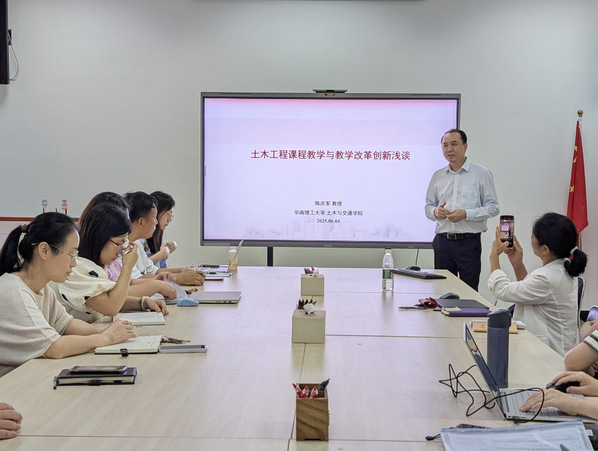 本网讯(记者 潘勇)6月4日下午,土木工程学院邀请华南理工大学陈庆军教授,在B1-201教室开展“土木工程课程教学与课程改革浅谈”专题讲座,学院全体教师现场聆听学习,气氛热烈。