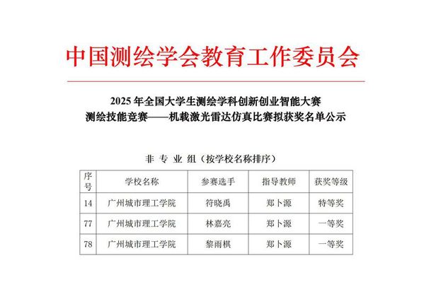 本讯网(记者 郑卜源)8月4日,由中国测绘学会教育工作委员会主办,内蒙古科技大学、南方测绘集团协办2025年全国大学生测绘学科创新创业智能大赛圆满落幕。作为入选《全国普通高校大学生竞赛分析报告》竞赛目录的高水平赛事,此次大赛吸引了全国近400所高校的7000余名学子同台竞技。我校土木工程学院参赛队伍经过激烈比拼,最终在“机载激光雷达仿真比赛”子赛项中脱颖而出:符晓禹同学凭借精湛的技术与创新的方案斩获特等奖,黎雨棋、林嘉亮同学则以稳定的发挥摘得一等奖,展现了我校学子在测绘遥感领域的深厚积累与实践能力,彰显了学校竞赛育人的扎实成果与人才培养的硬核实力。